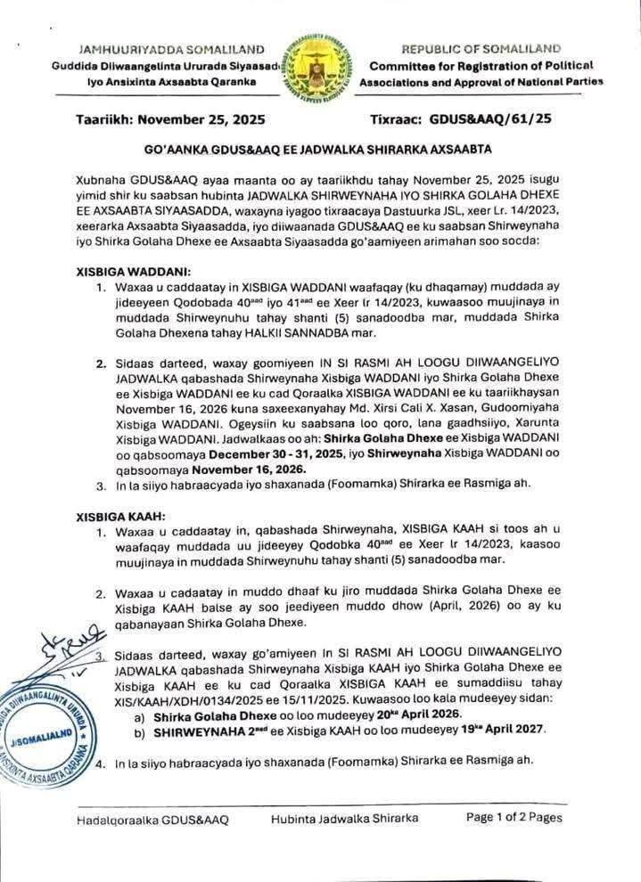 The The Registration and Approval Committee of Somaliland National Parties and Organizations has demanded that Kulmiye set a date for the congress within a short, non-negotiable window of 30 days. This pressure cooker timeline eliminates Kahin’s preferred strategy of indefinite delay.